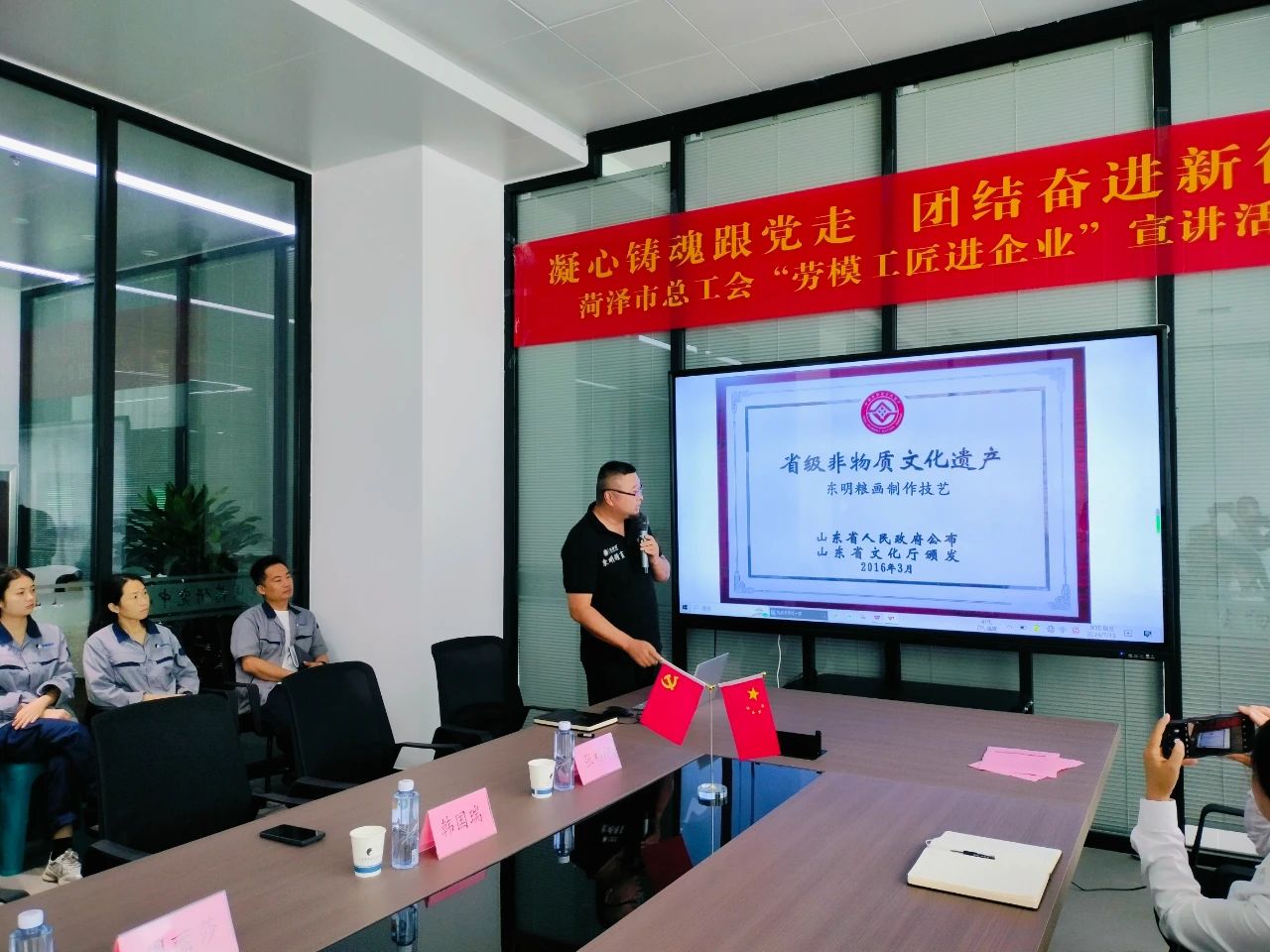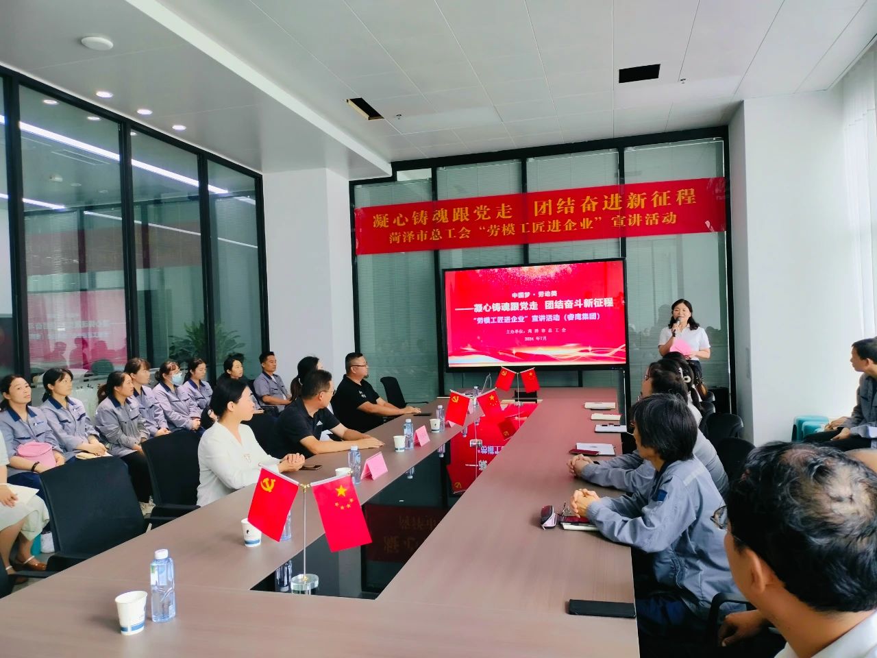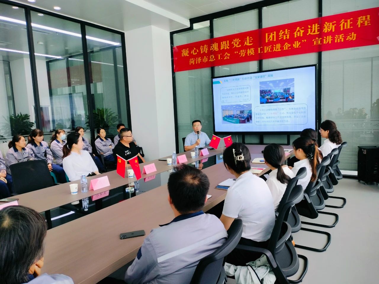 7月19日上午9时30分,,,在新总部大楼一楼西会议室,,,,来自集团各公司和分厂的行政专员、、、工会主席以及优秀职工代表共计50余人齐聚一堂,,,,聚精会神地聆听来自菏泽市总工会劳模工匠宣讲团讲师的精彩宣讲。。市总工会宣教部周丽莎、、牡丹区总工会党组成员、、、、副主席沙启军,,东明县总工会女工委主任孟瑞欣等领导同志出席活动。。。。